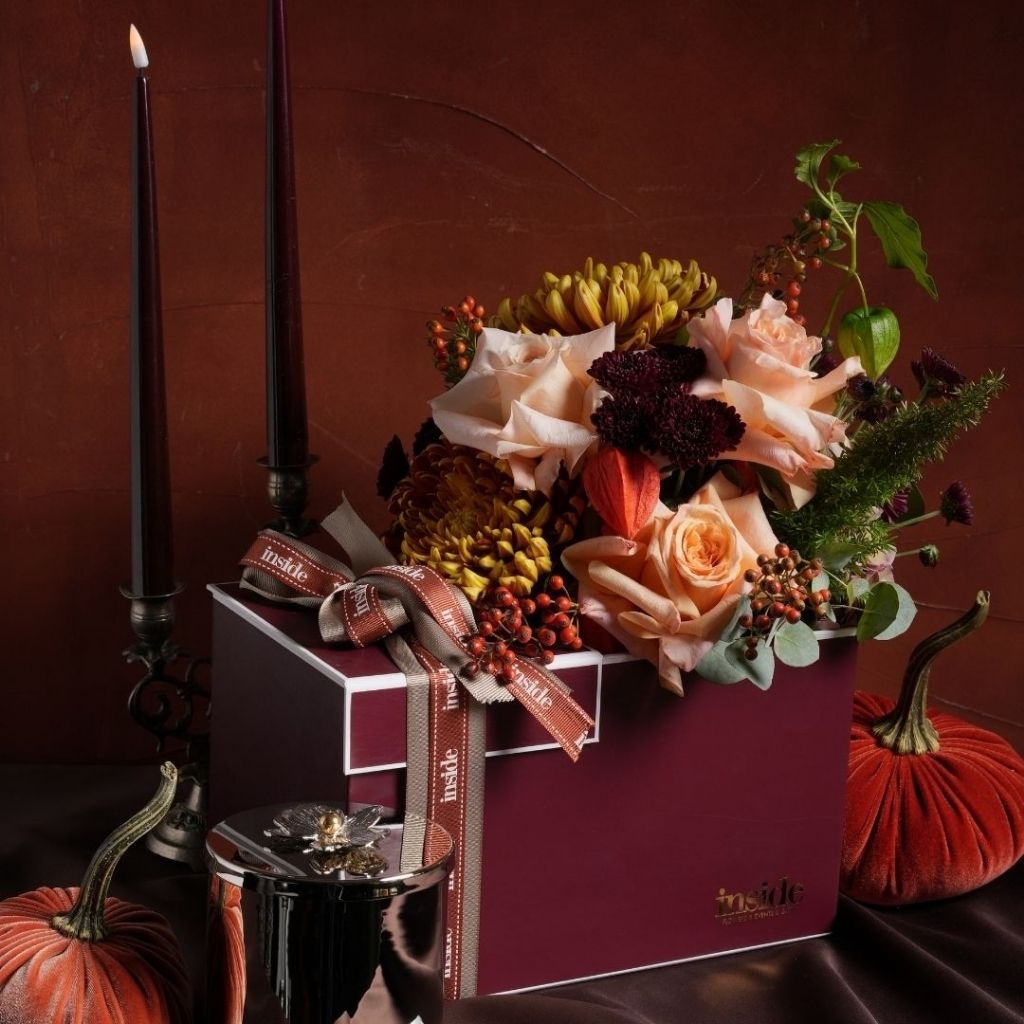 Kutu içerisinde gümüş kaplama vazo içerisinde çiçek aranjmanı ve gümüş kaplama bonbonier içerisinde 400 gr. çikolata bulunmaktadır.