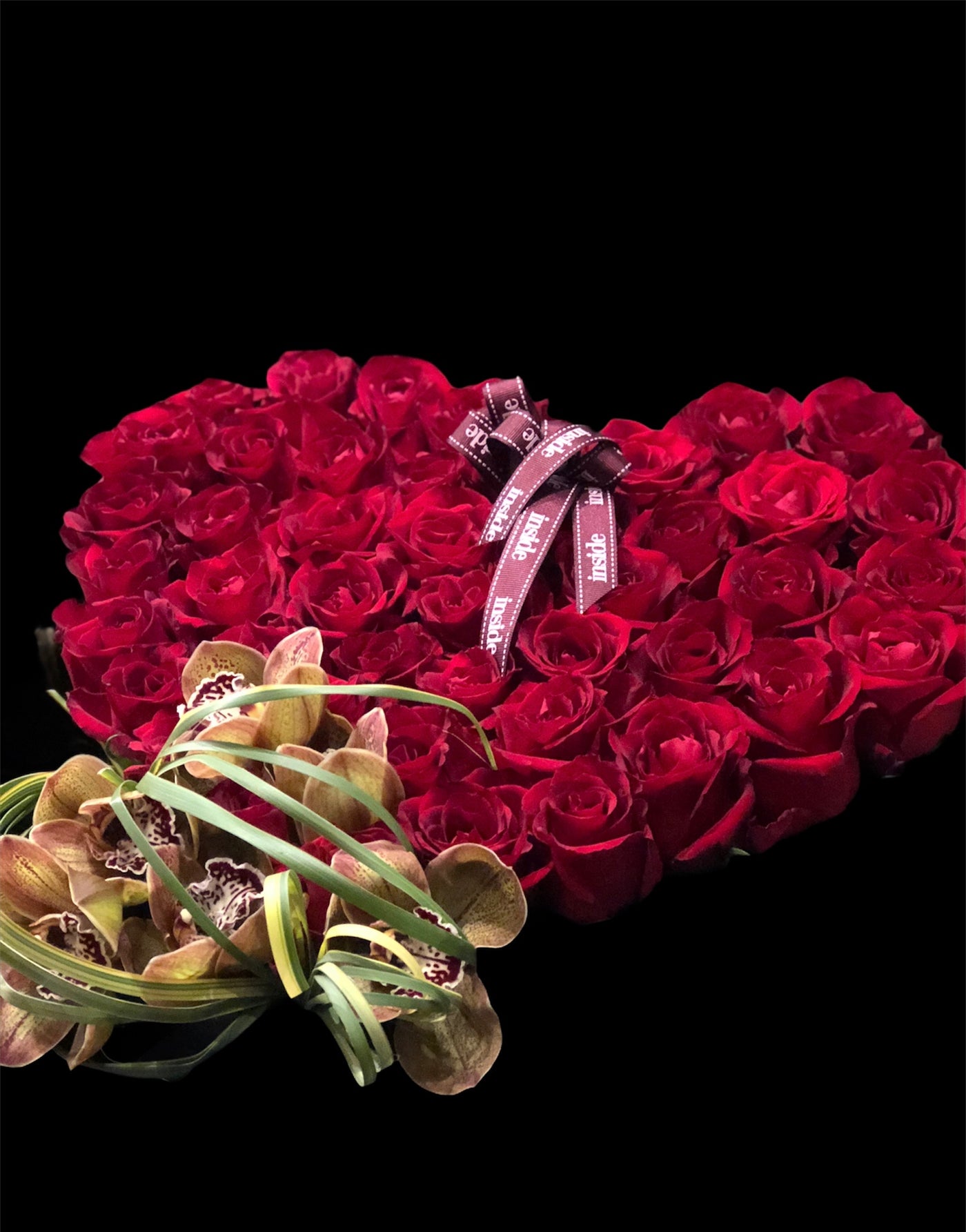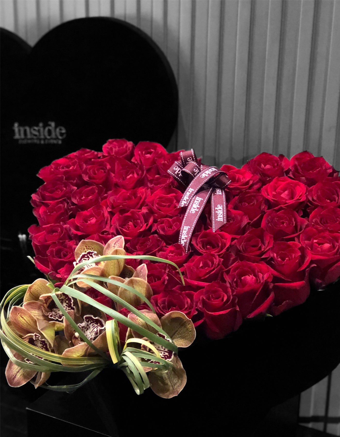 Kutu içerisine kırmızı güller kenarına orkideler…