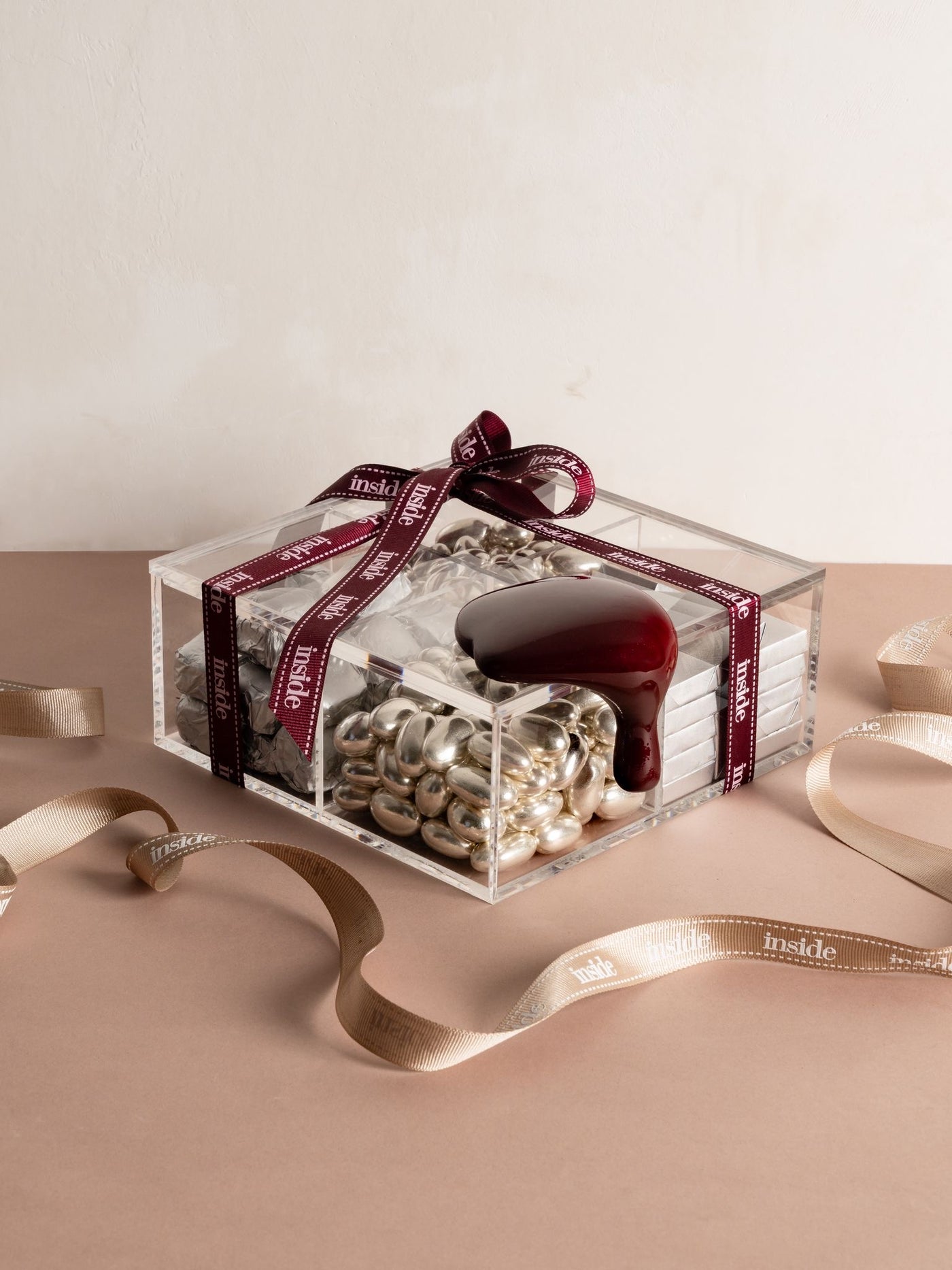 Kutu 20 x 20 cm boyutundadır. içerisinde sütlü, krokan ve badem draje bulunmaktadır.